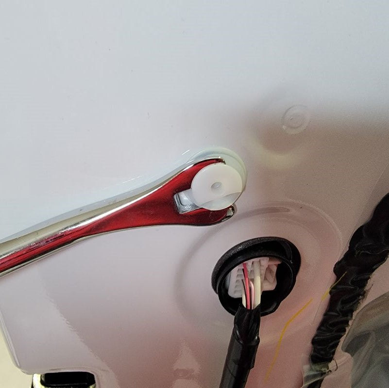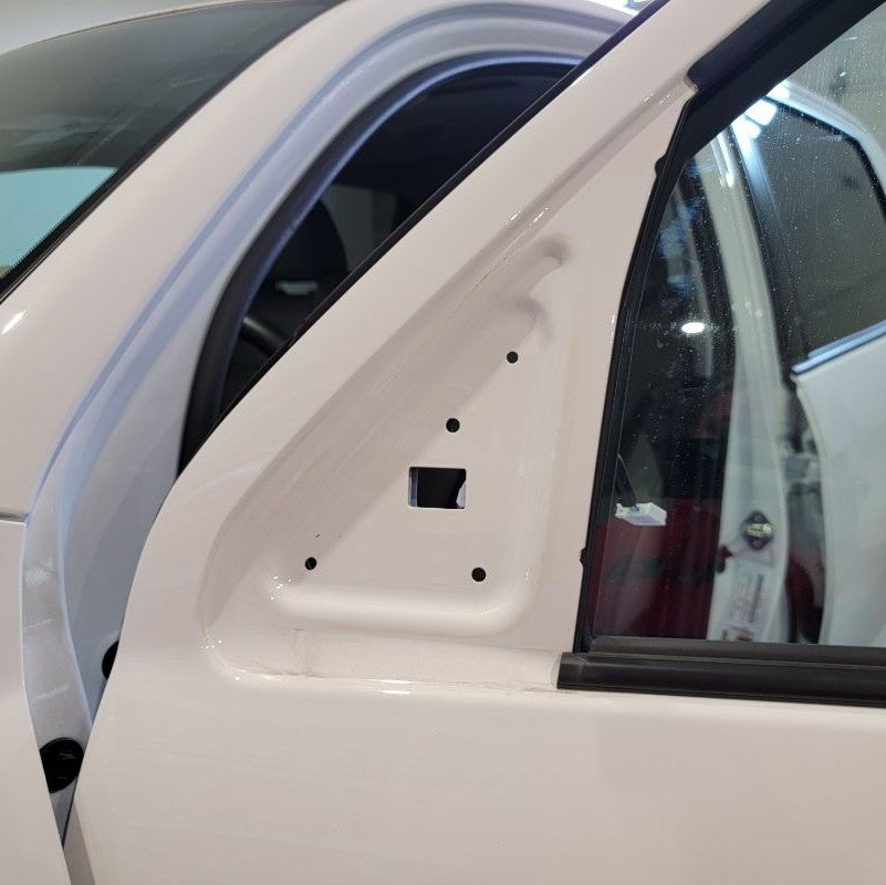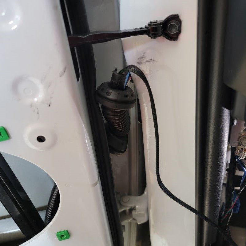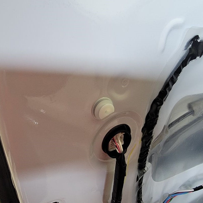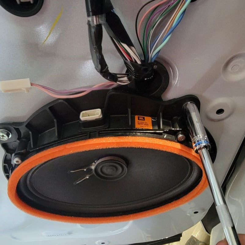 Let’s re-attach them to the vehicle with the three original 10mm nuts. Make sure the wires are cleanly pulled through to the inner side of the door. Be careful not to lose your 10mm nuts in between the door panels because they will be lost for good.