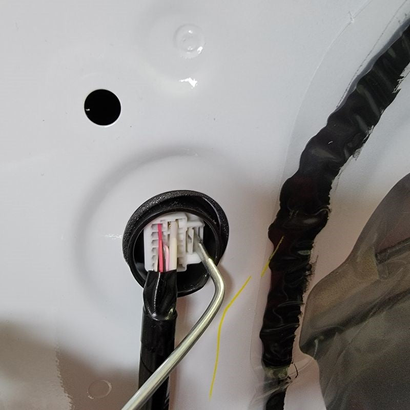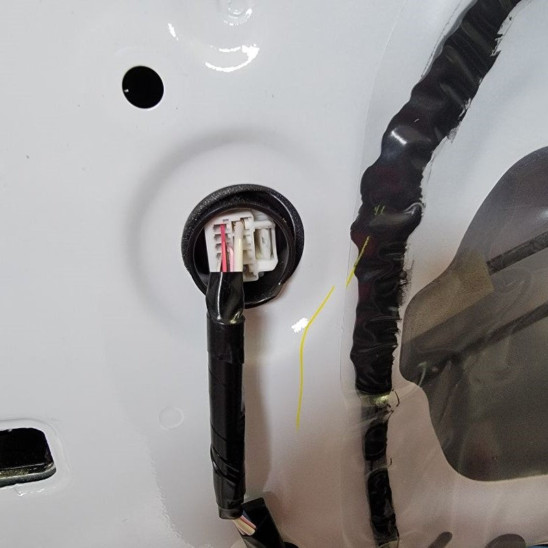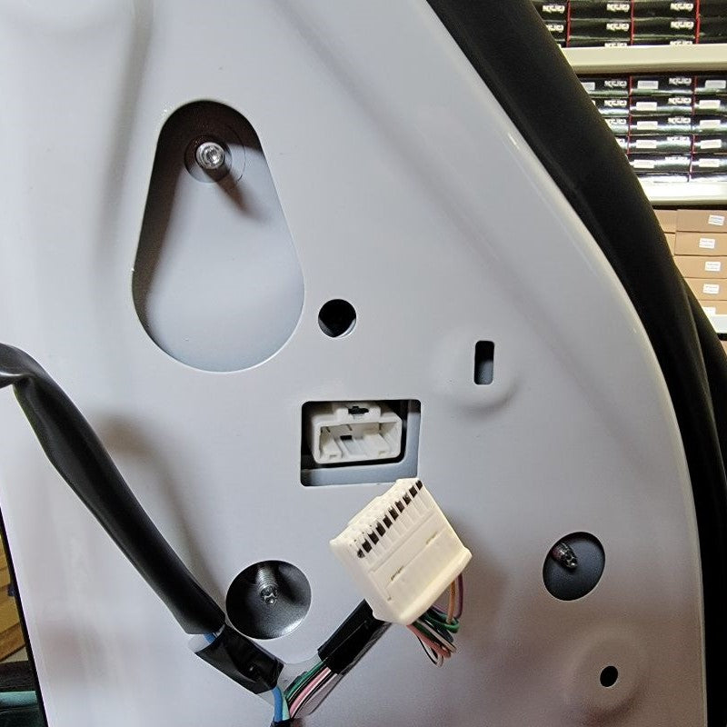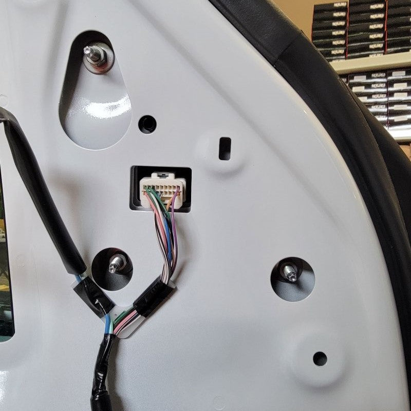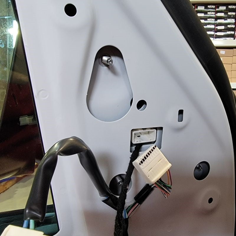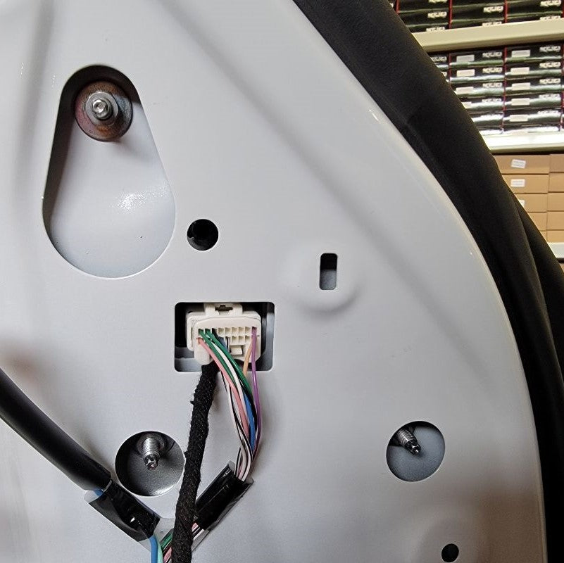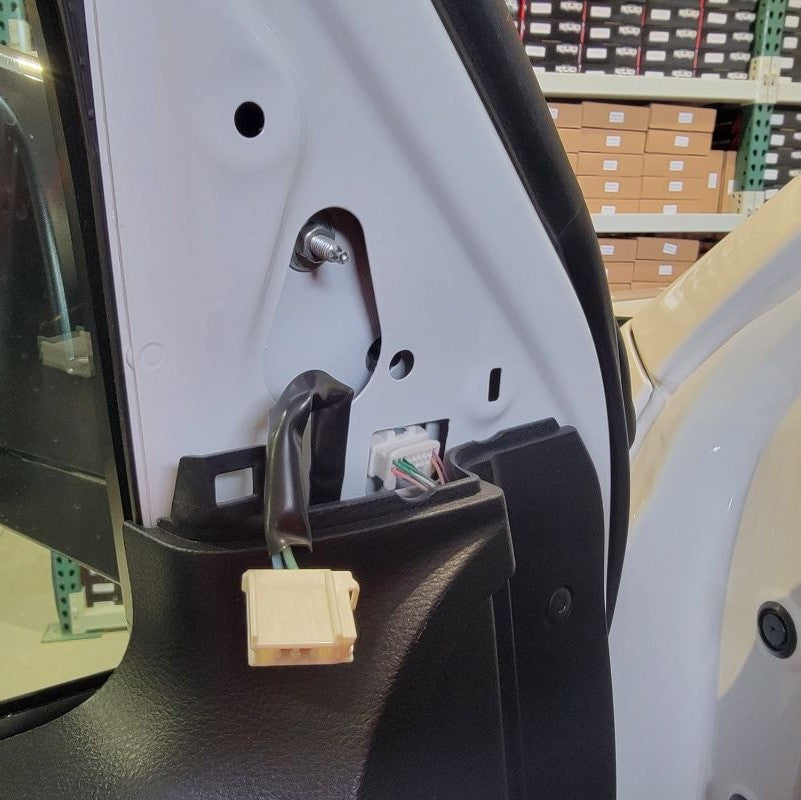 With now having the door frame exposed, we can easily find the mirror connector – just follow the wire that’s coming out of the mirror and routing down to the white connector at the top right side of the door. Remove the connector and any tape holding the cable in place.