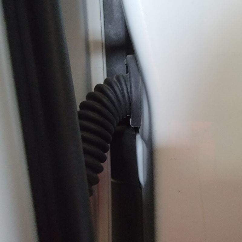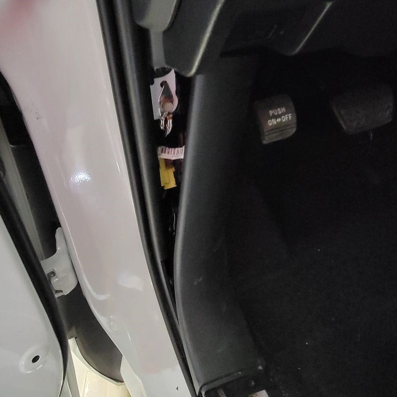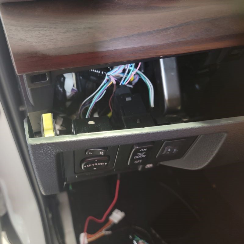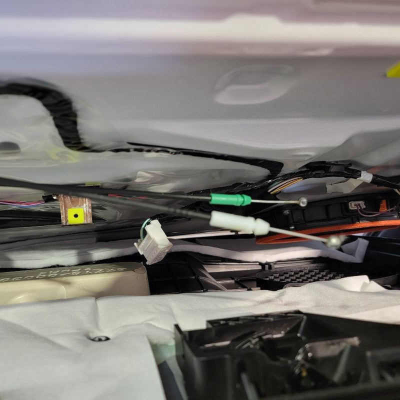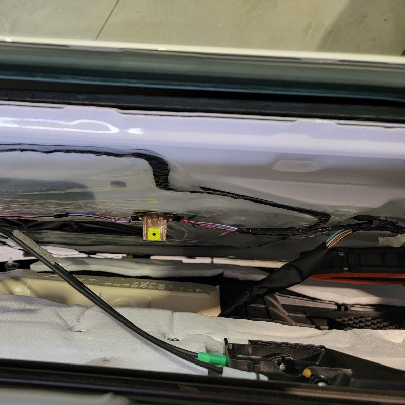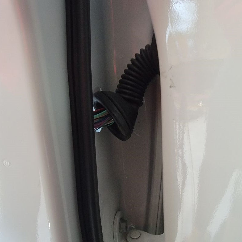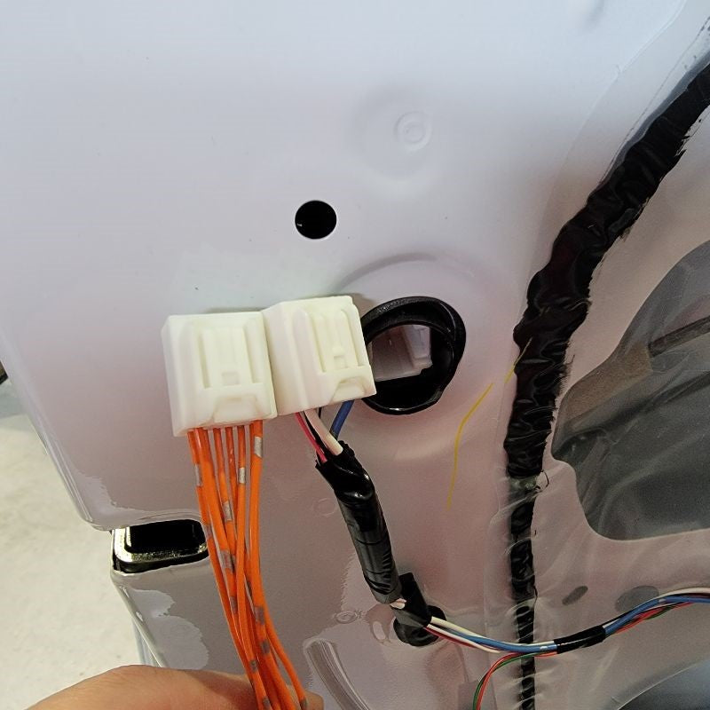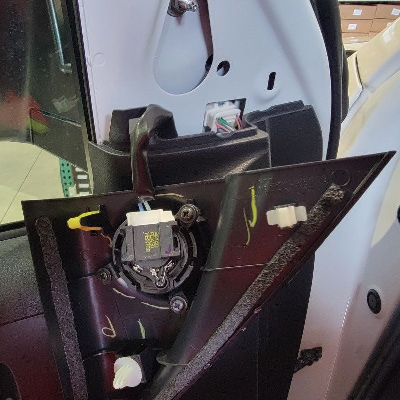 With now having the door frame exposed, we can easily find the mirror connector – just follow the wire that’s coming out of the mirror and routing down to the white connector at the top right side of the door. Remove the connector and any tape holding the cable in place.