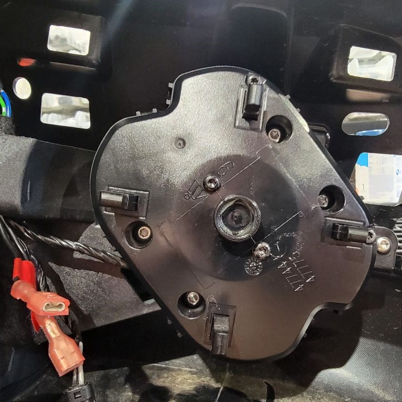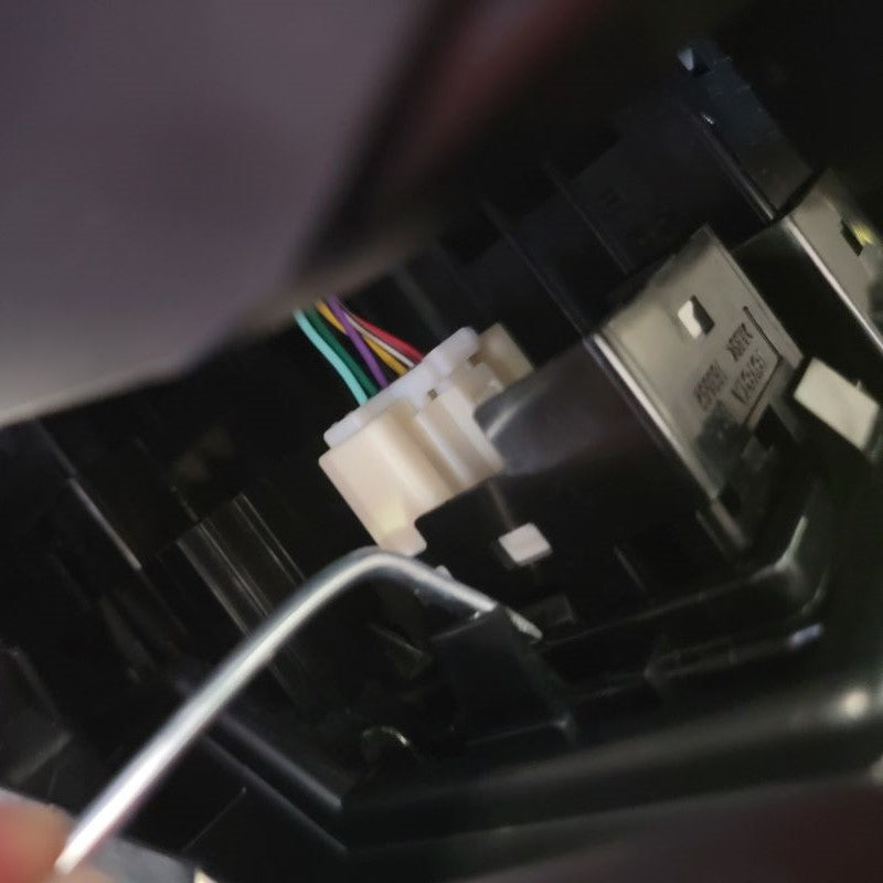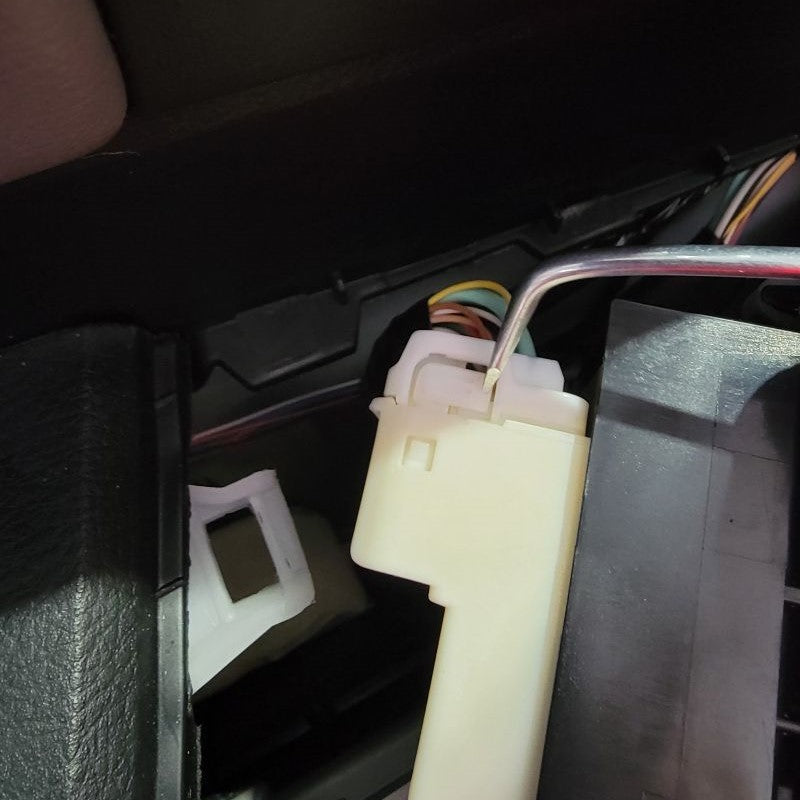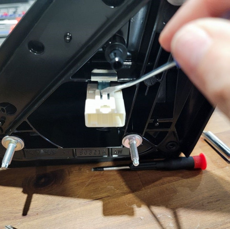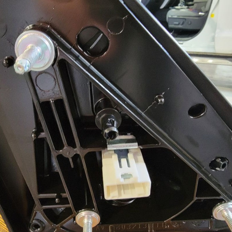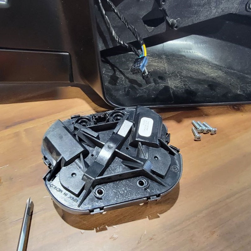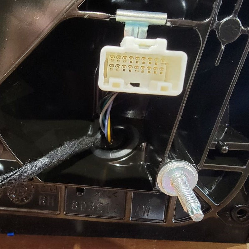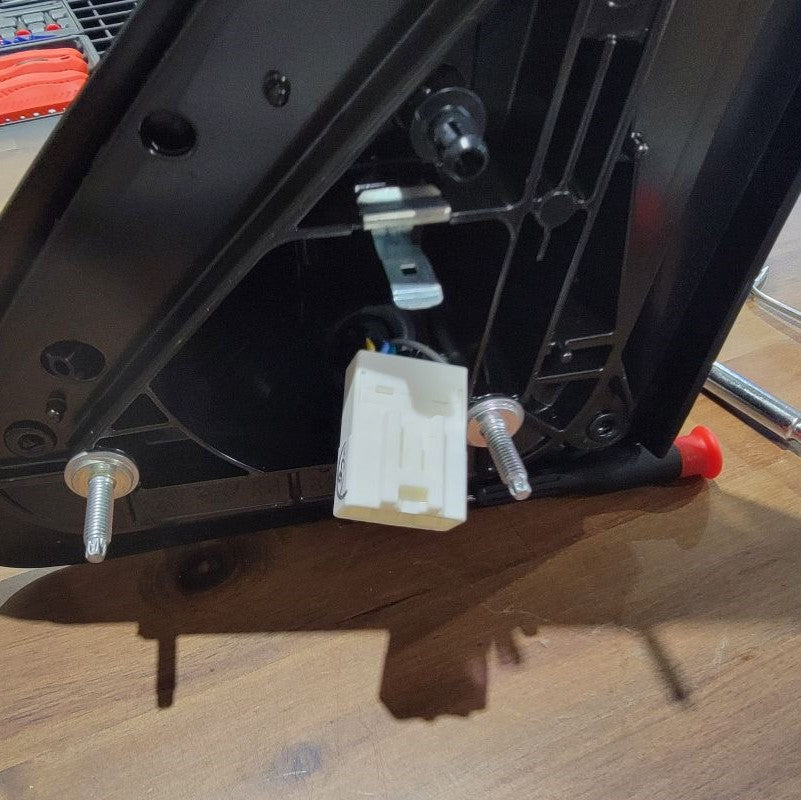 Continuing to use a T15 Torx Screwdriver, remove the 2 screws that are securing the connection plate to the mirror housing. Set all hardware that you remove to the side for future reinstallation. Now you can remove the rubber isolator to reveal the white connector and wires that are held in by a black grommet. Start with lifting the tab on the top of the white connector to release it from the metal clip. Directly following that, you may be able to just pull the grommet outward, but if not, use a small flathead screwdriver to get underneath and lift up. This now releases the wire harness.