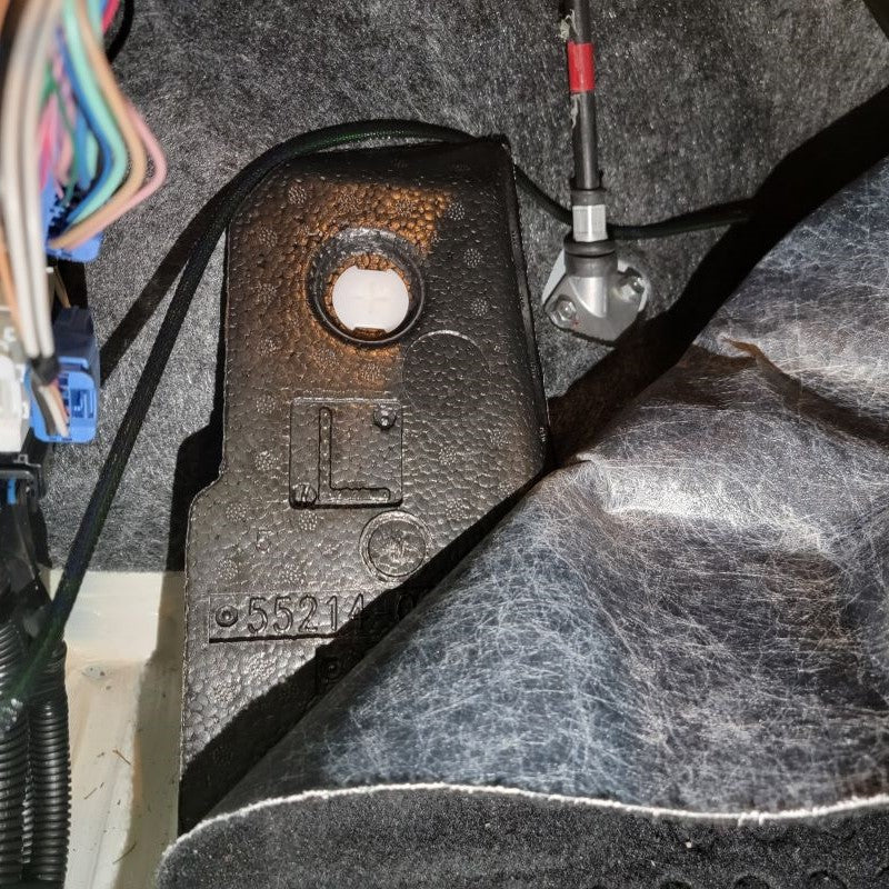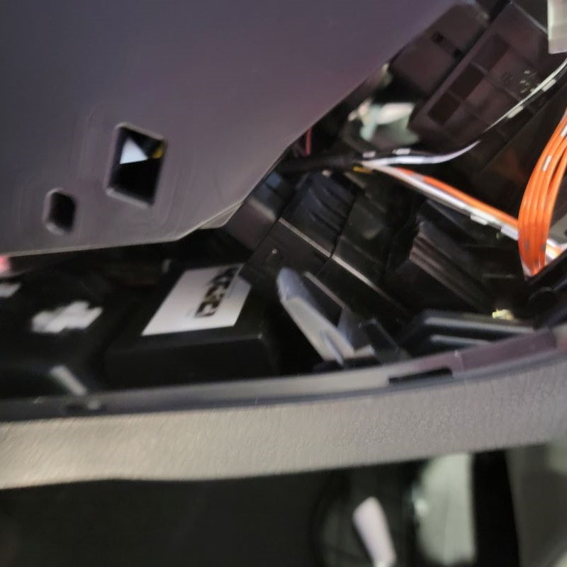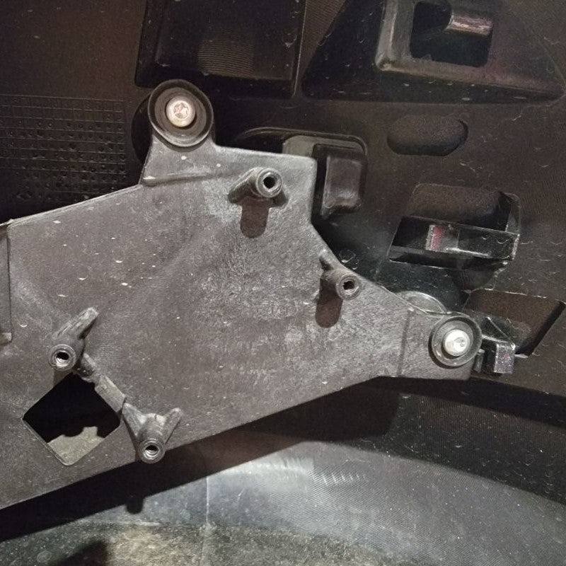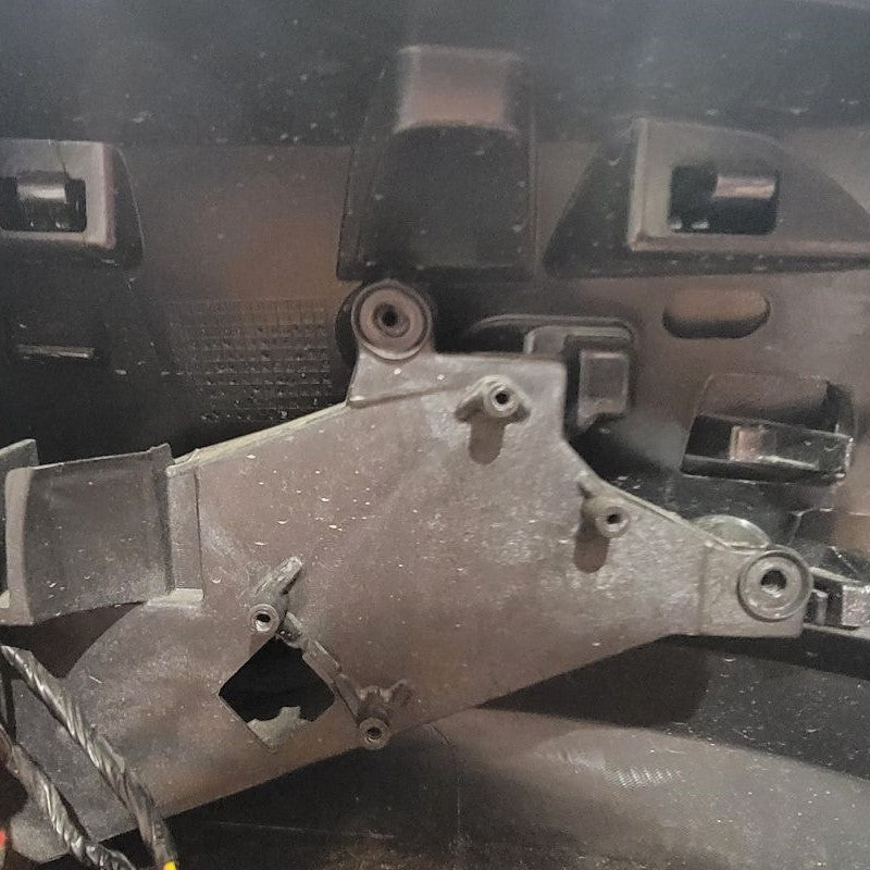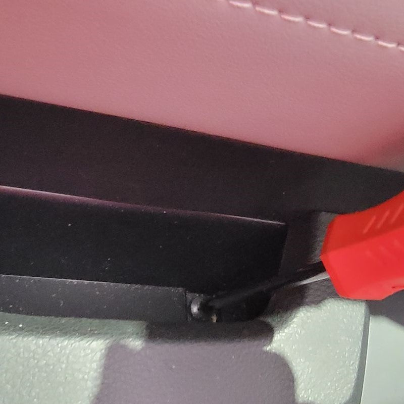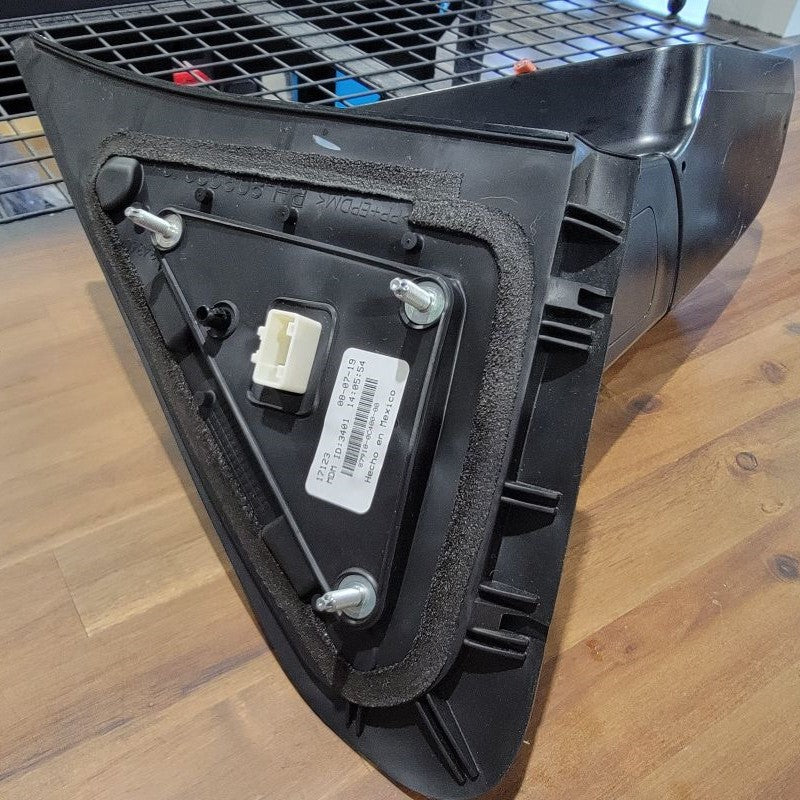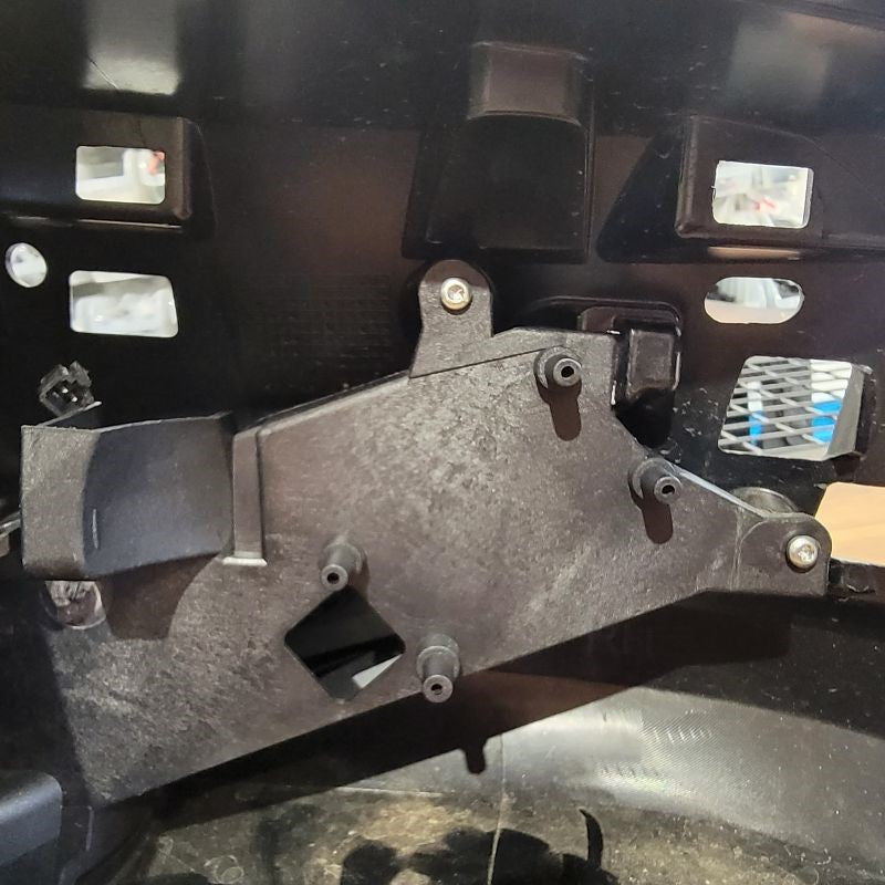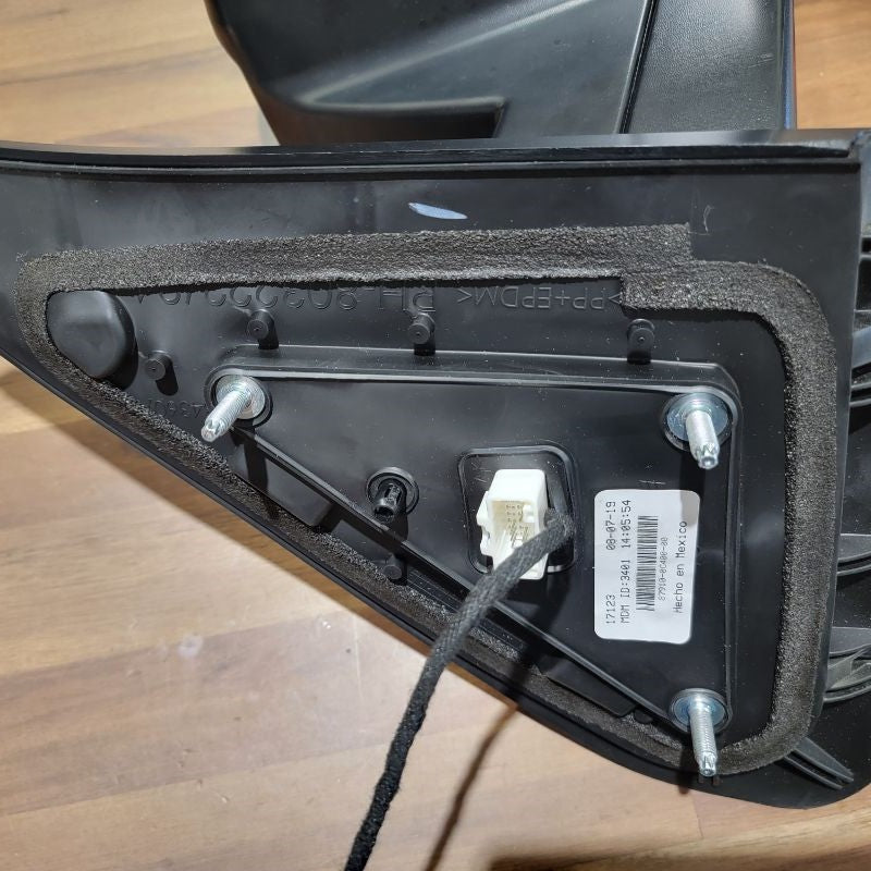 Continuing to use a T15 Torx Screwdriver, remove the 2 screws that are securing the connection plate to the mirror housing. Set all hardware that you remove to the side for future reinstallation. Now you can remove the rubber isolator to reveal the white connector and wires that are held in by a black grommet. Start with lifting the tab on the top of the white connector to release it from the metal clip. Directly following that, you may be able to just pull the grommet outward, but if not, use a small flathead screwdriver to get underneath and lift up. This now releases the wire harness.