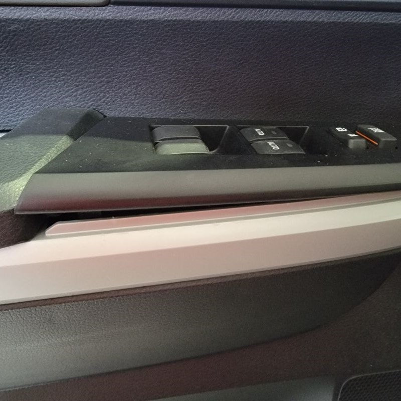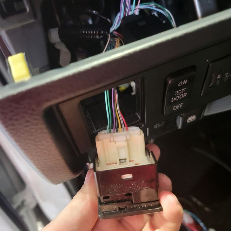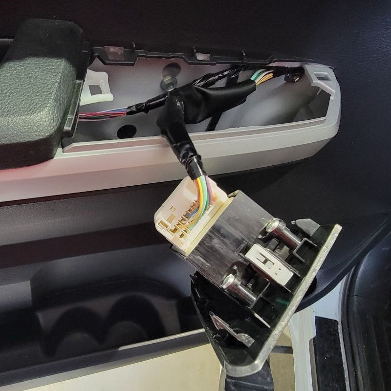Before trying to lift and pull off the door panel, disconnect and remove all the connections on the backside of the panel. First, disconnect the master window switch connector located under the window switch that you will need to remove from the door panel. You’ll have to slightly pull the bottom of the switch panel away from the door panel to access the connector. Push down on the tab on the side of the white connector to disconnect.