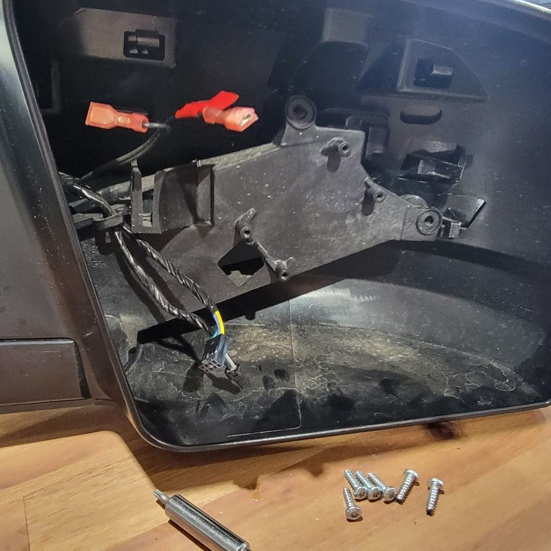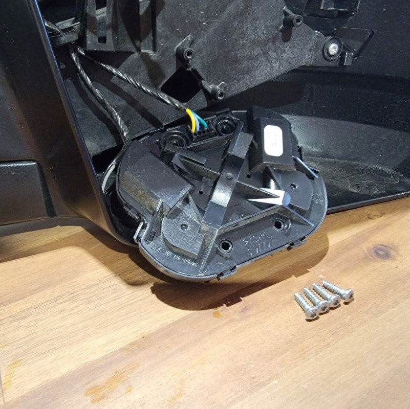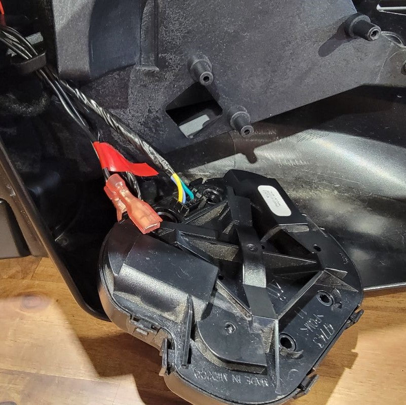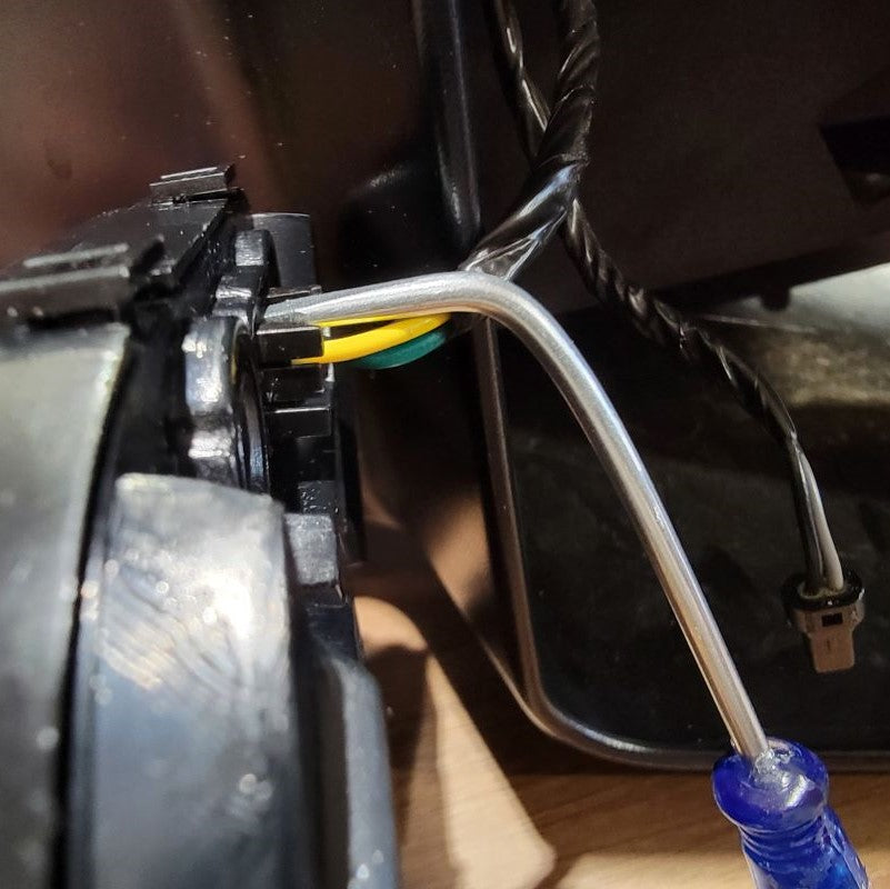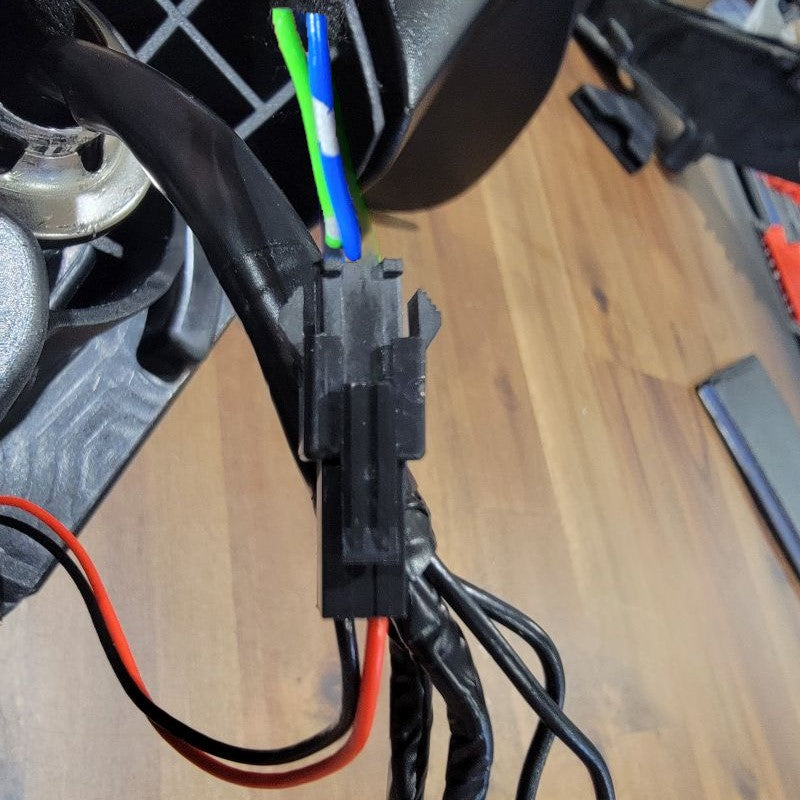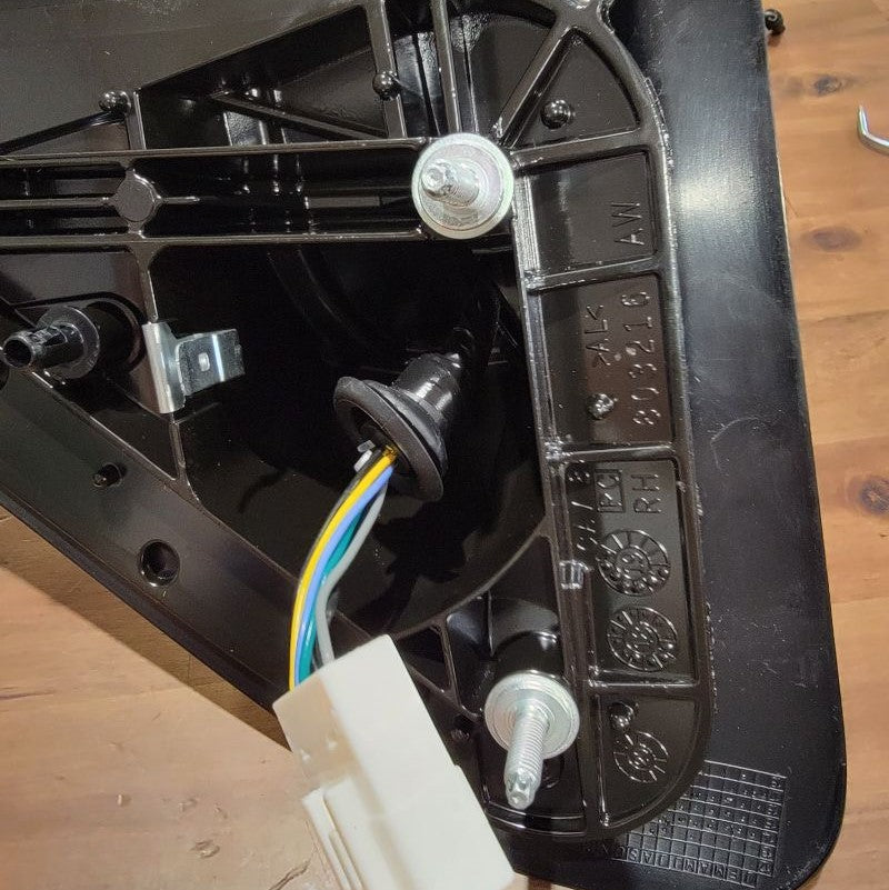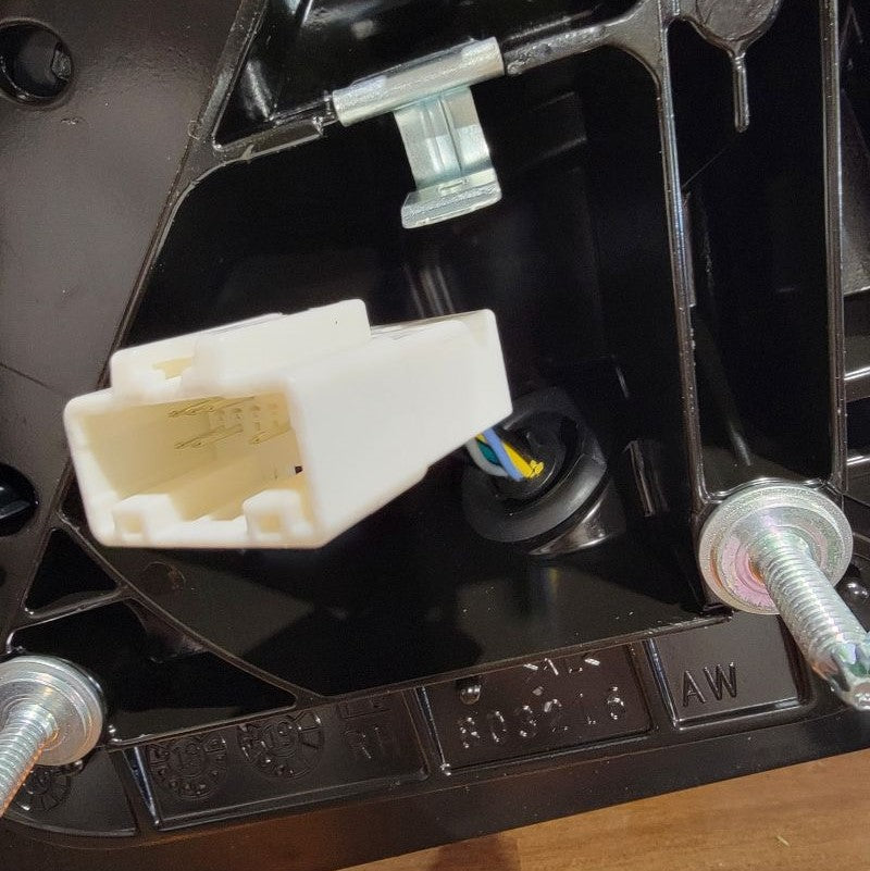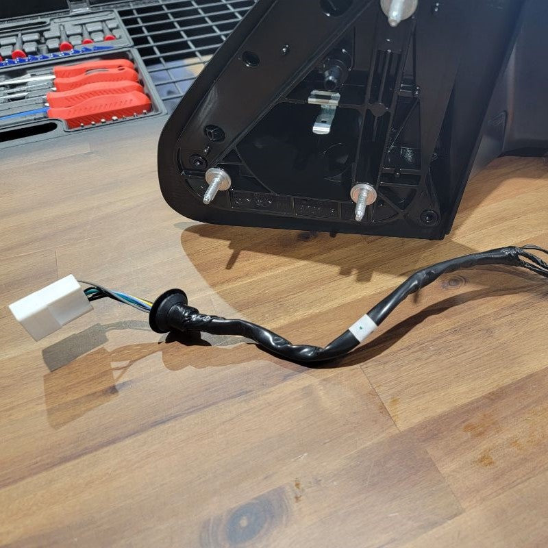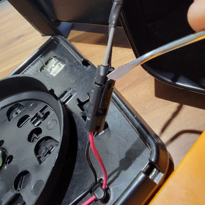Now that we’re done pulling the cable through tight gaps, we can reassemble the two inner connectors into the outer housing and plug it back into the mirror receptacle. The power wires from the motor remain free.