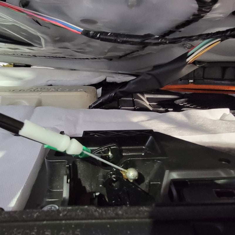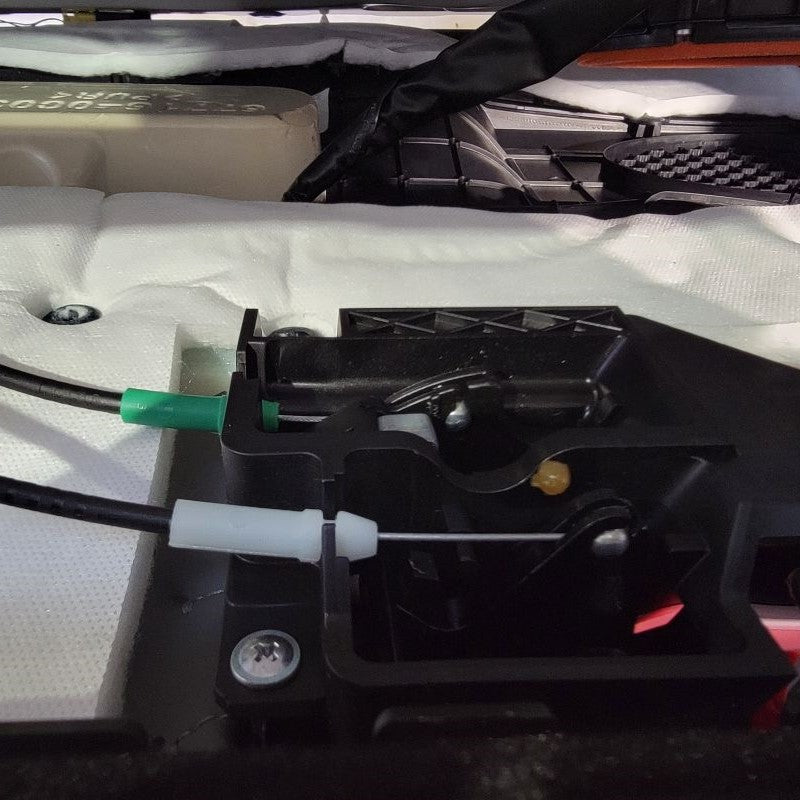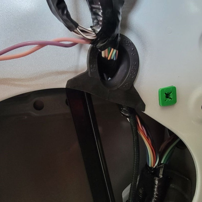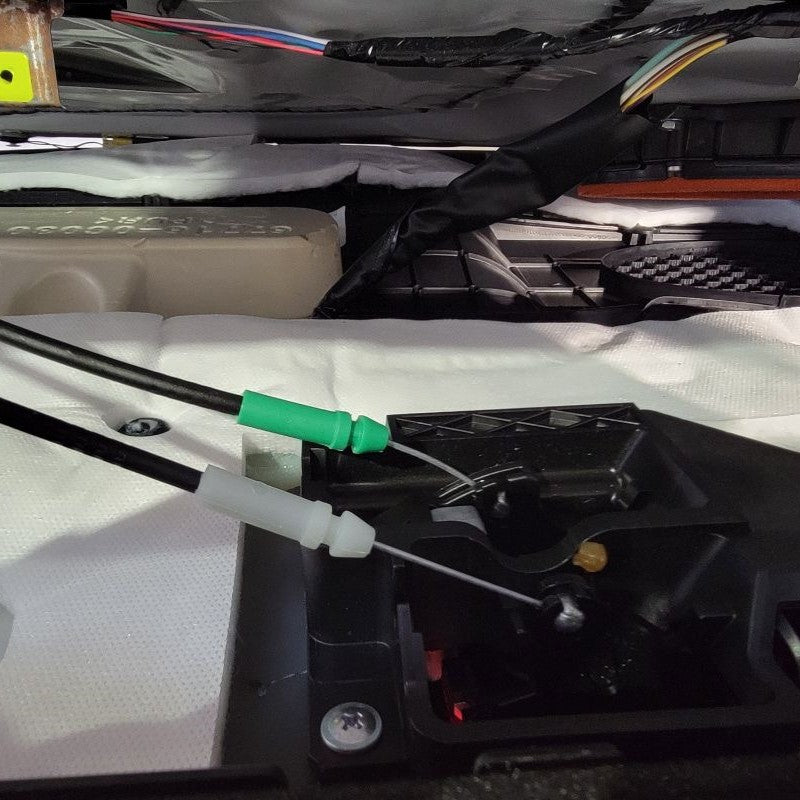 If you look behind the door panel you just pulled off, you’ll see one white and one green Bowden Cable termination. Carefully snap these out of the black housing and maneuver the steel cable ends out of their enclosures. If you should see anymore white connectors that may be connected to your door panel, this is the time to unplug them as they may be the last connections standing in the way of removing the door panel completely from the door frame.