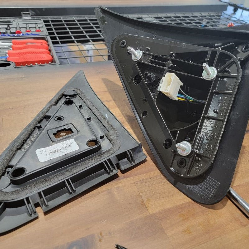 Using the trim removal tool, carefully pry open the mirror housing from the connection arm. It’s a handful of snap fits, so be careful not to break any. Remove completely and set to the side.