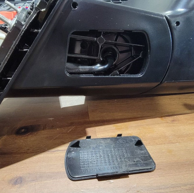 Next, unbolt the mirror assembly by removing the three 10mm nuts that were exposed in Step 1. Carefully push back the black plastic tab that’s still holding the mirror in place and pull the whole assembly out, cable and all.