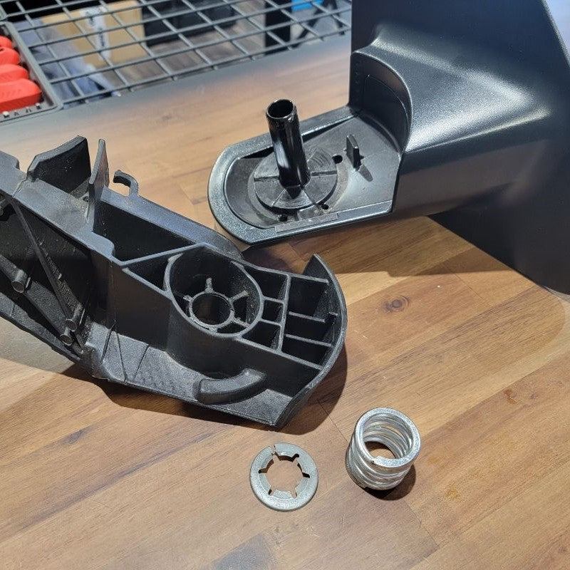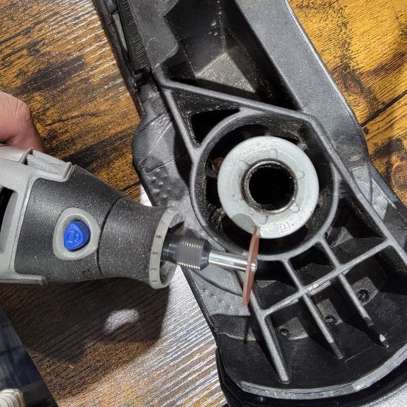 Bring out your dremel or your choice of tool for this next step. You will need something that can cut into the metal clip that is keeping the mirror spring-loaded in open and closed detents. BE CAREFUL with this step as the spring metal clip can go flying once it is released from the spring. It is recommended to wear eye protection.
