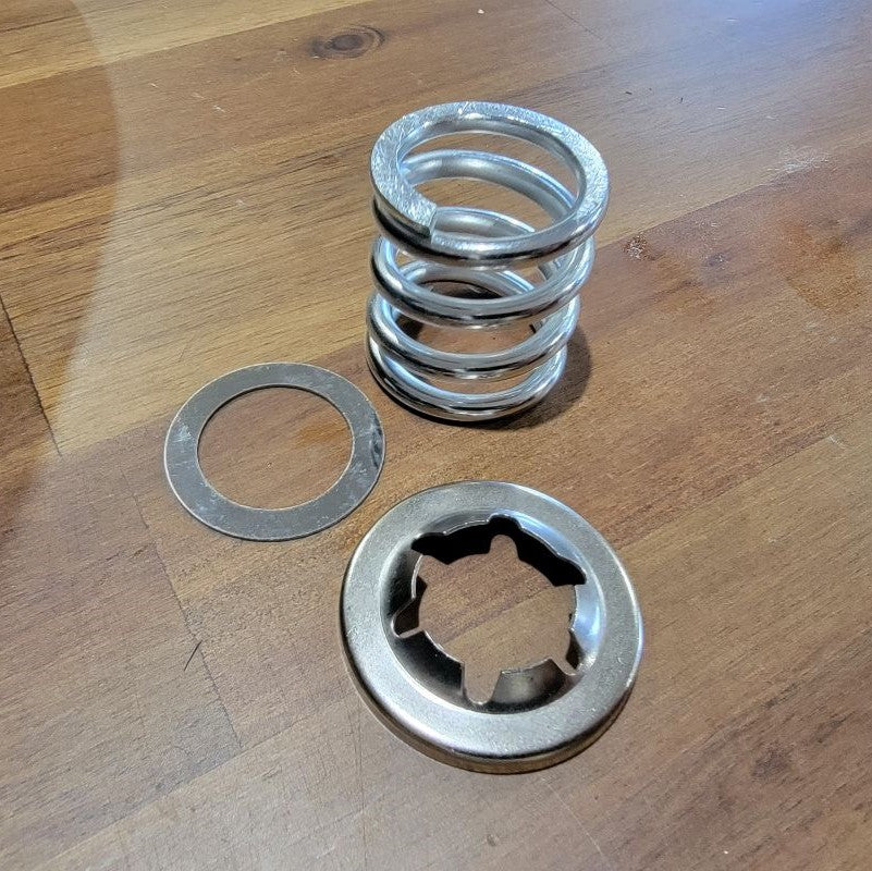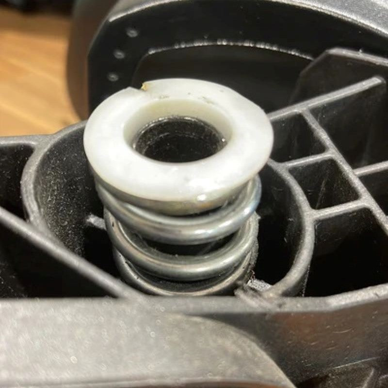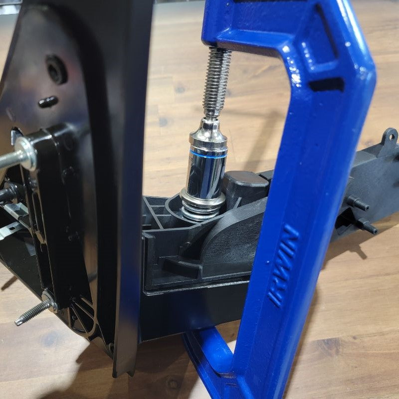 Lastly, compressing the spring back into place can be tricky but be patient. You can use a C-Clamp or anything you may have of similiar like. Once you have all the new hardware in place, your new connection plate arm will be held in place.