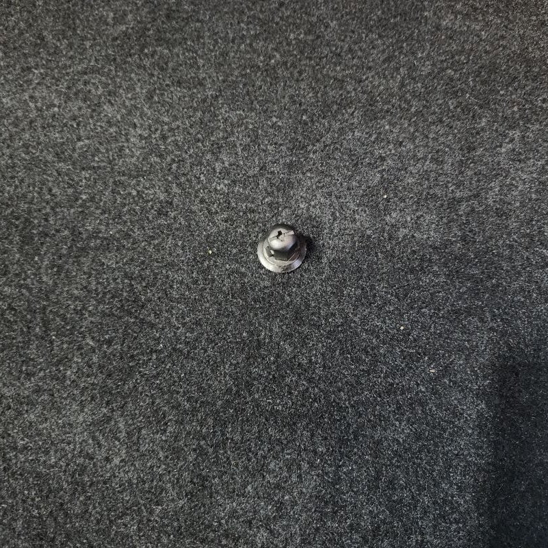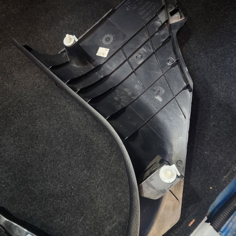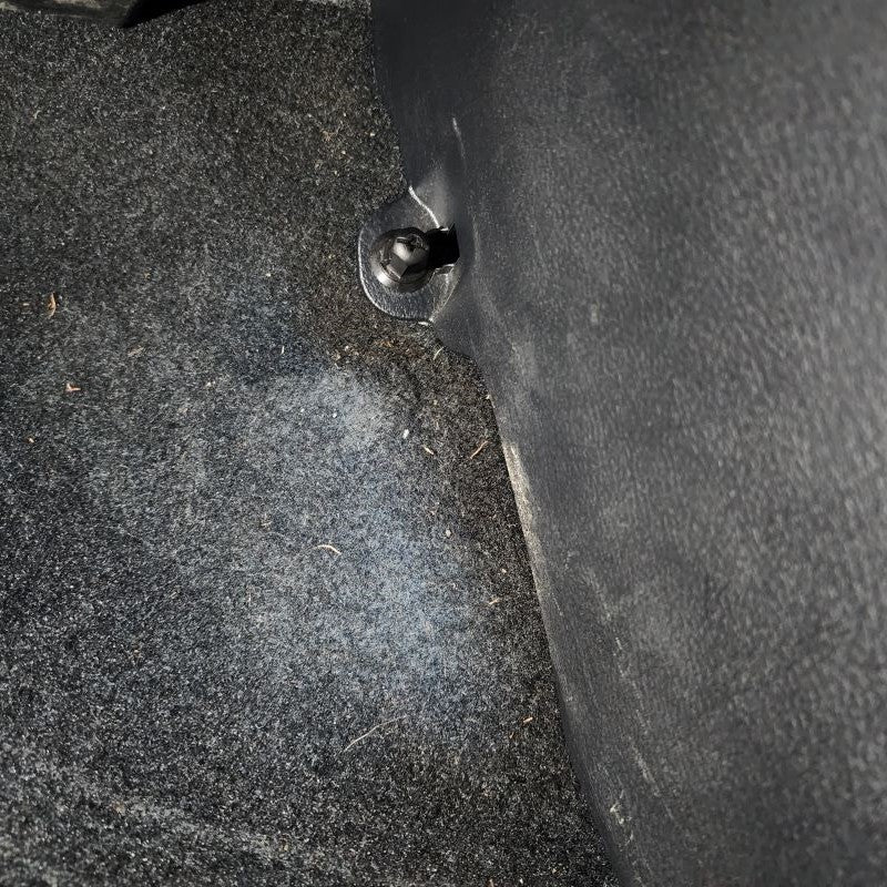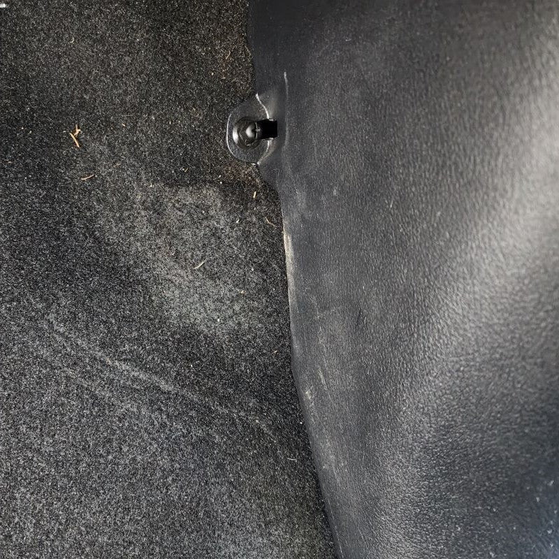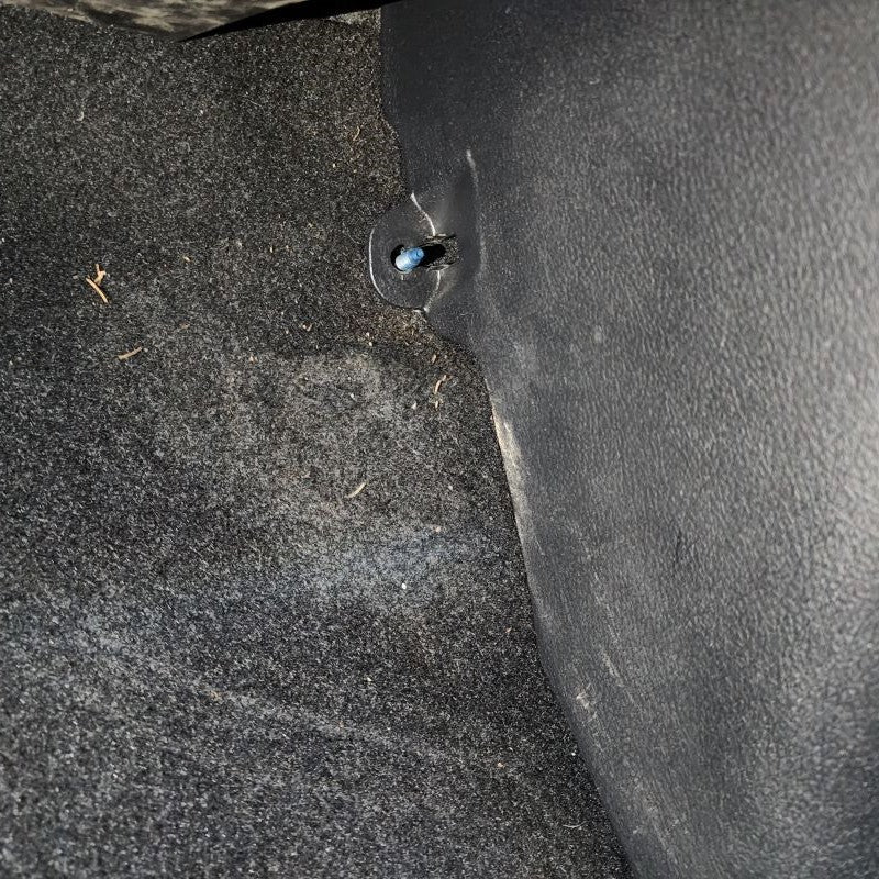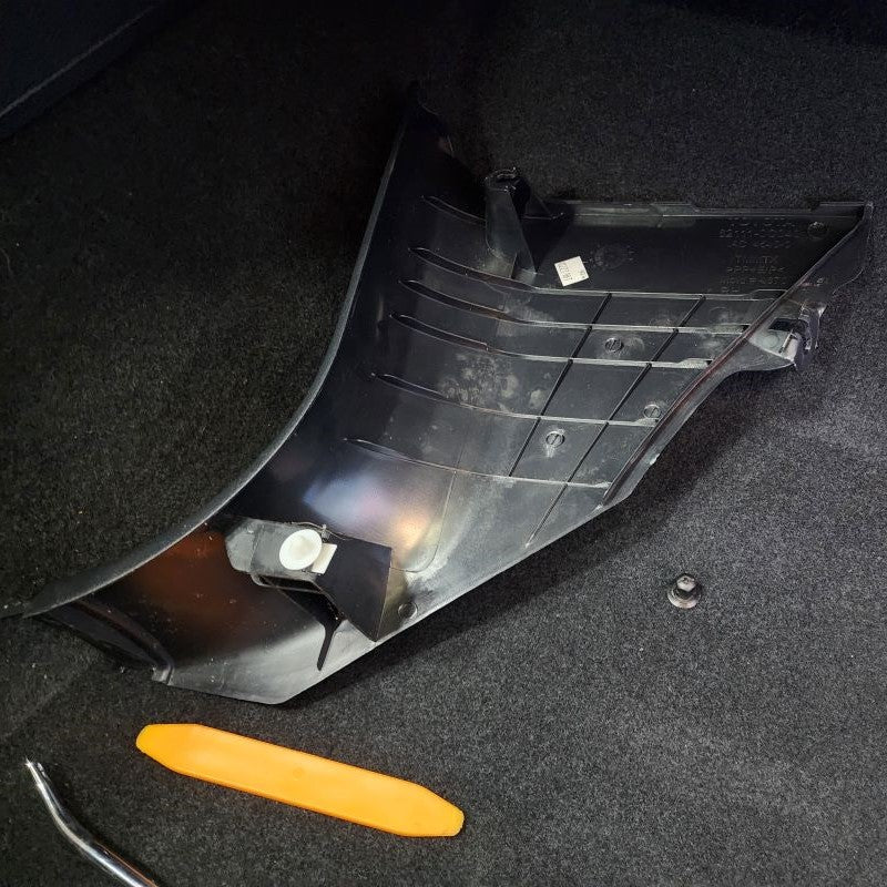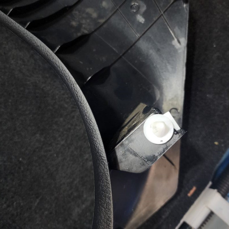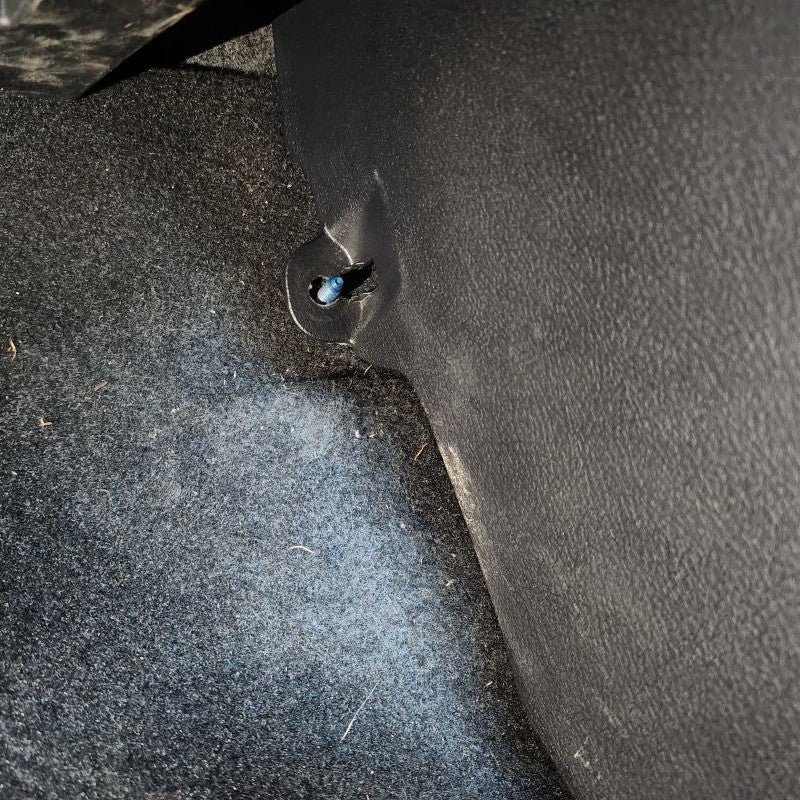 Using your hands, reach in the back corner where you will find a black fastener that is securing the kick plate to the carpet area. Once you have the threaded fastener removed, you can use a Trim Removal Tool or just your fingertips to get behind the top corner panel like shown below. This kick panel is held in by two white push-in tab fasteners on the inside. Set aside for later.