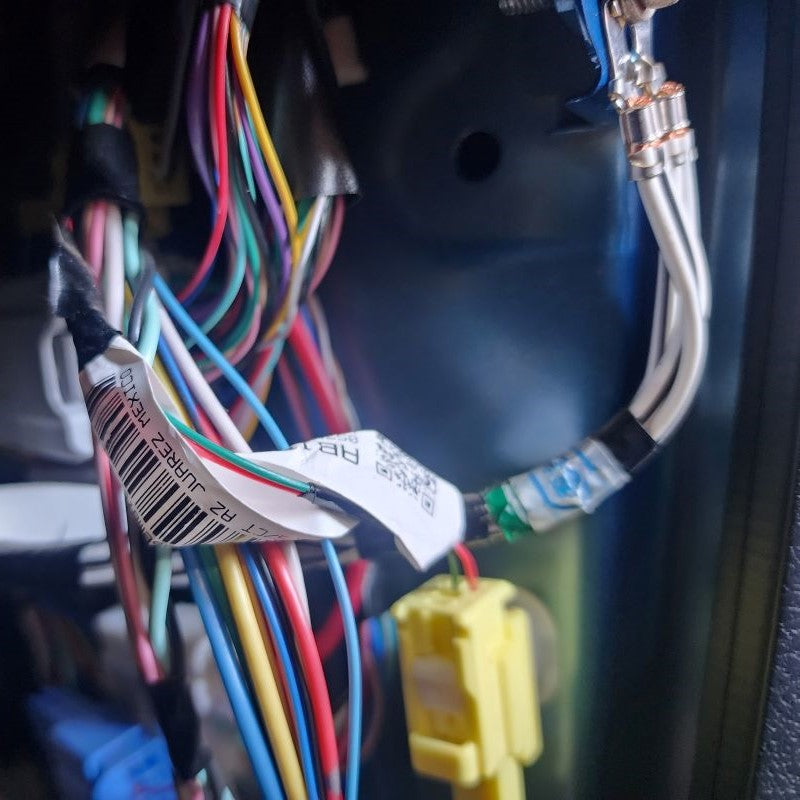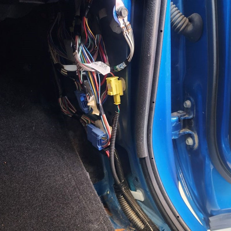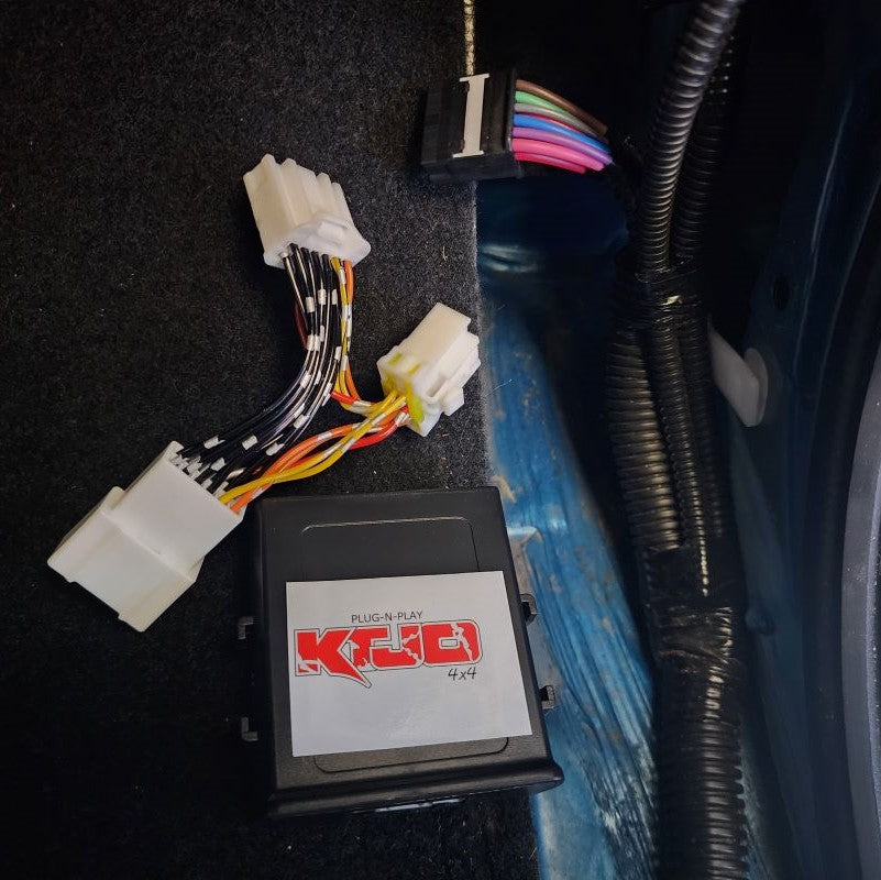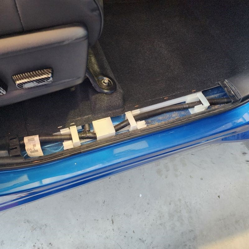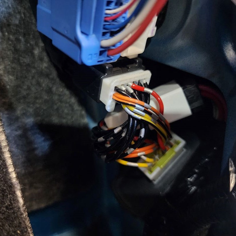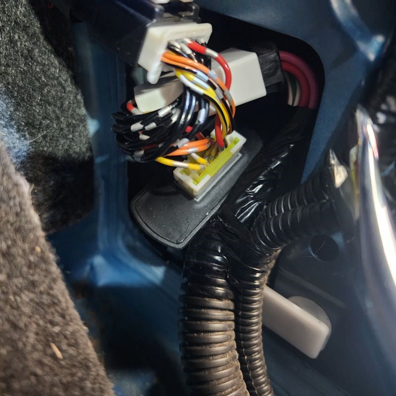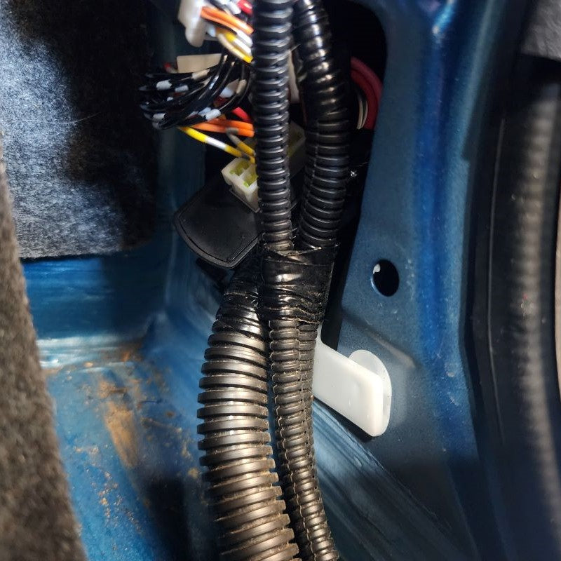 Using your included one touch harness, connect it to your factory harness inside your door panel. In reverse order of Step 2, you are going to want to install the kick panel. Make sure to align those two white tabs so they will lock in your panel. Finish by hand tightening the black fastener in the back corner.