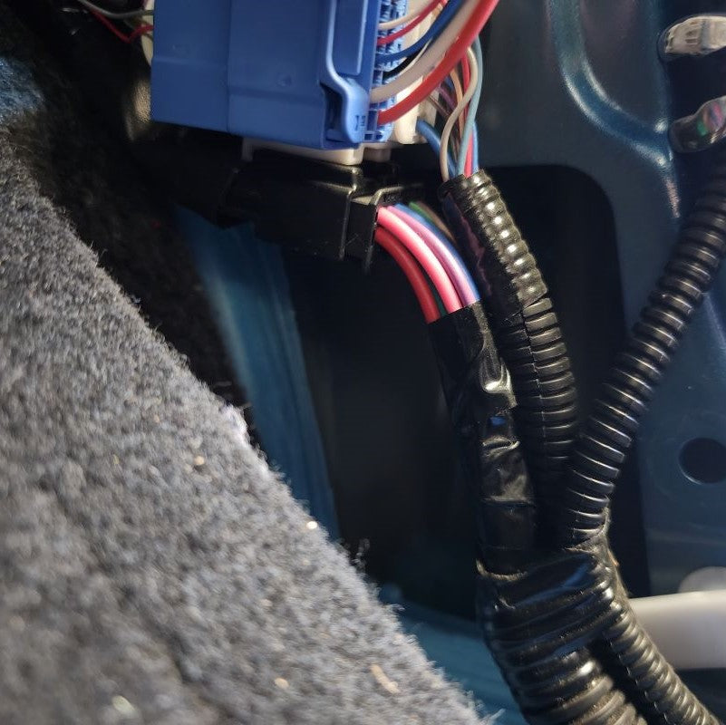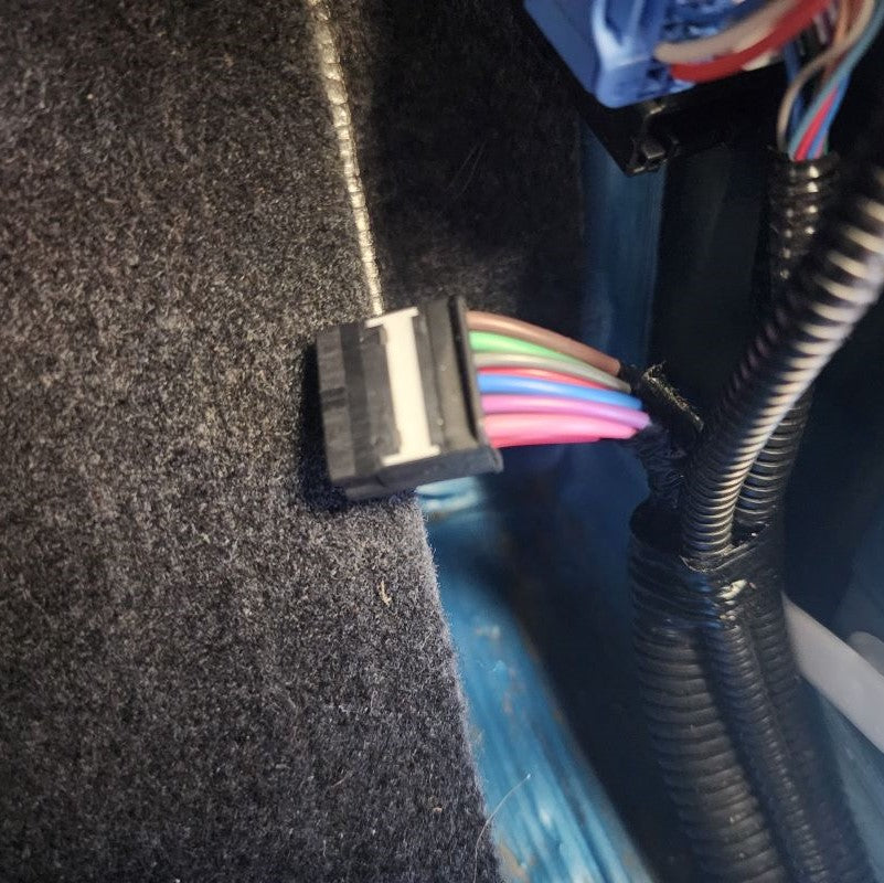 Now you will need to locate your rear windshield factory connector. It is black and at the bottom. Simply use the tab on the connector to push down and release from its holding location inside the kick panel area.